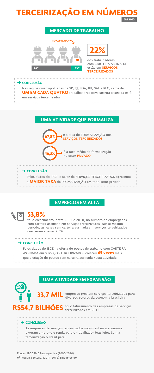 Além de apresentar taxa de formalização superior à média do setor privado, os serviços terceirizados também vem puxando o crescimento do mercado de trabalho nos últimos anos. A pesquisa do IBGE mostra que o número de trabalhadores com carteira assinada cresceu 53,8%, entre 2003 e 2010, nessa atividade econômica. No mesmo período, o número de postos de trabalho sem carteira assinada em serviços terceirizados foi de apenas 2,9%. “O dado contraria o argumento de que o trabalho terceirizado revoga ou afronta direitos trabalhistas”, conclui Furlan.