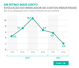 O Indicador de Custos Industriais é composto por Custo de Produção, Custo de Capital de Giro e Custo Tributário. De acordo com a CNI, o custo de produção - formado pelos custos com insumos, energia e pessoal - cresceu 4,9% no segundo trimestre na comparação com igual período de 2012. Foi a menor alta desde o primeiro trimestre de 2012.